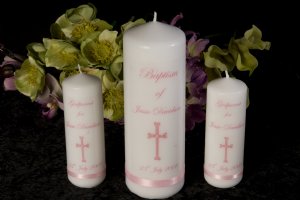 This candle has a unique style of pink cross. The main candle has the words "Baptism of" (or Christening of if you prefer - just put a note in the comments section on the order form online) and the name and date of Baptism/Christening. It also has the name of the Church if you wish(again let us know in the comments section of your order). The godparent candles have the words "Godparent to" and the name and date of baptism or christening. Each candle has a band of pink satin ribbon at the base of the candle. Each candle comes packaged in a beautiful organza bag